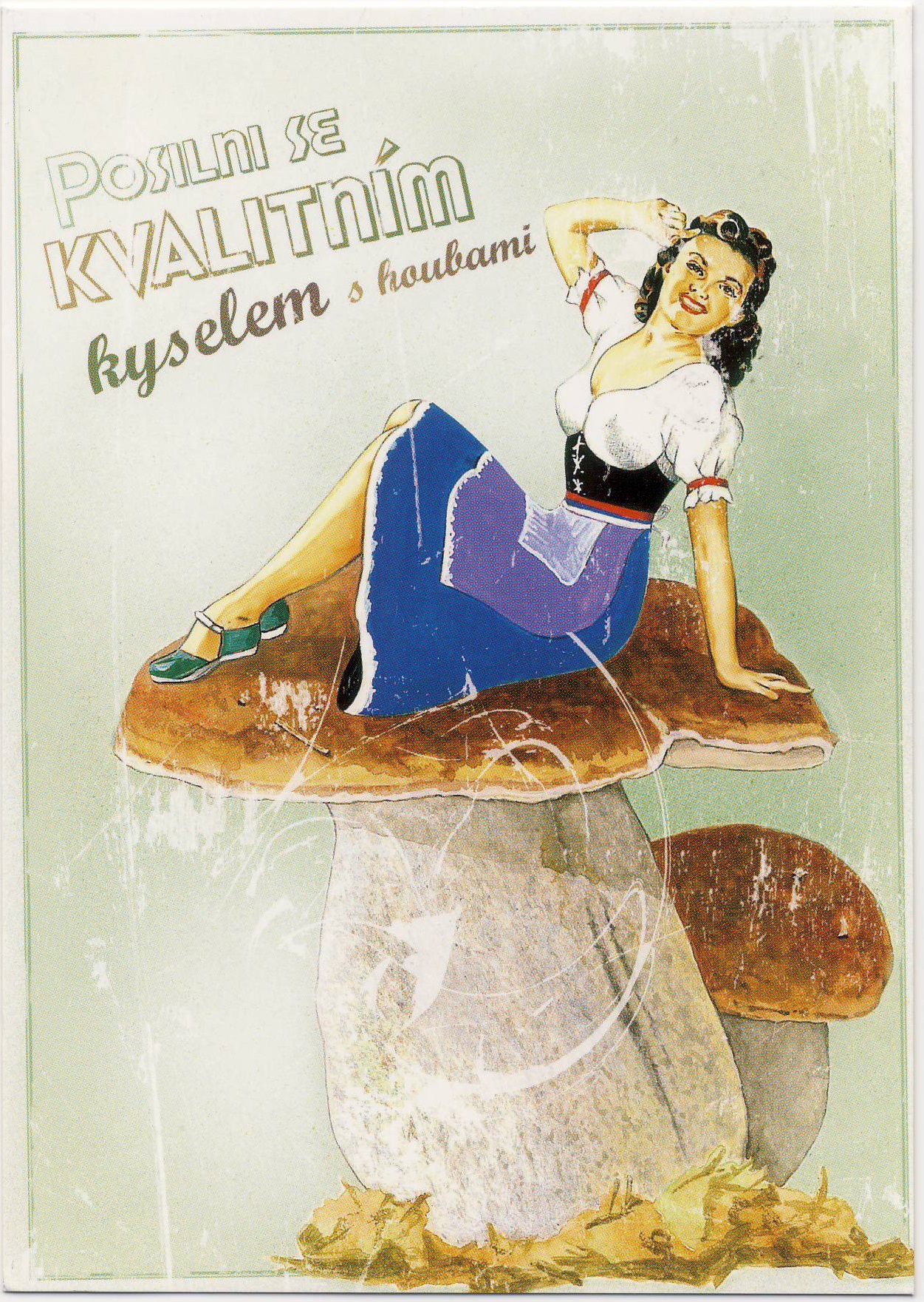 I’m not exactly a fan of mushrooms, but I love the old pin-up feel of this card. This one hails from the Czech Republic and the reverse of the card actually provides a recipe for kyselo, which the sender tells me is a typical Czech soup from mushrooms. Summer is mushroom picking season, an ingredient that seems to be a favorite in many Czech meals!