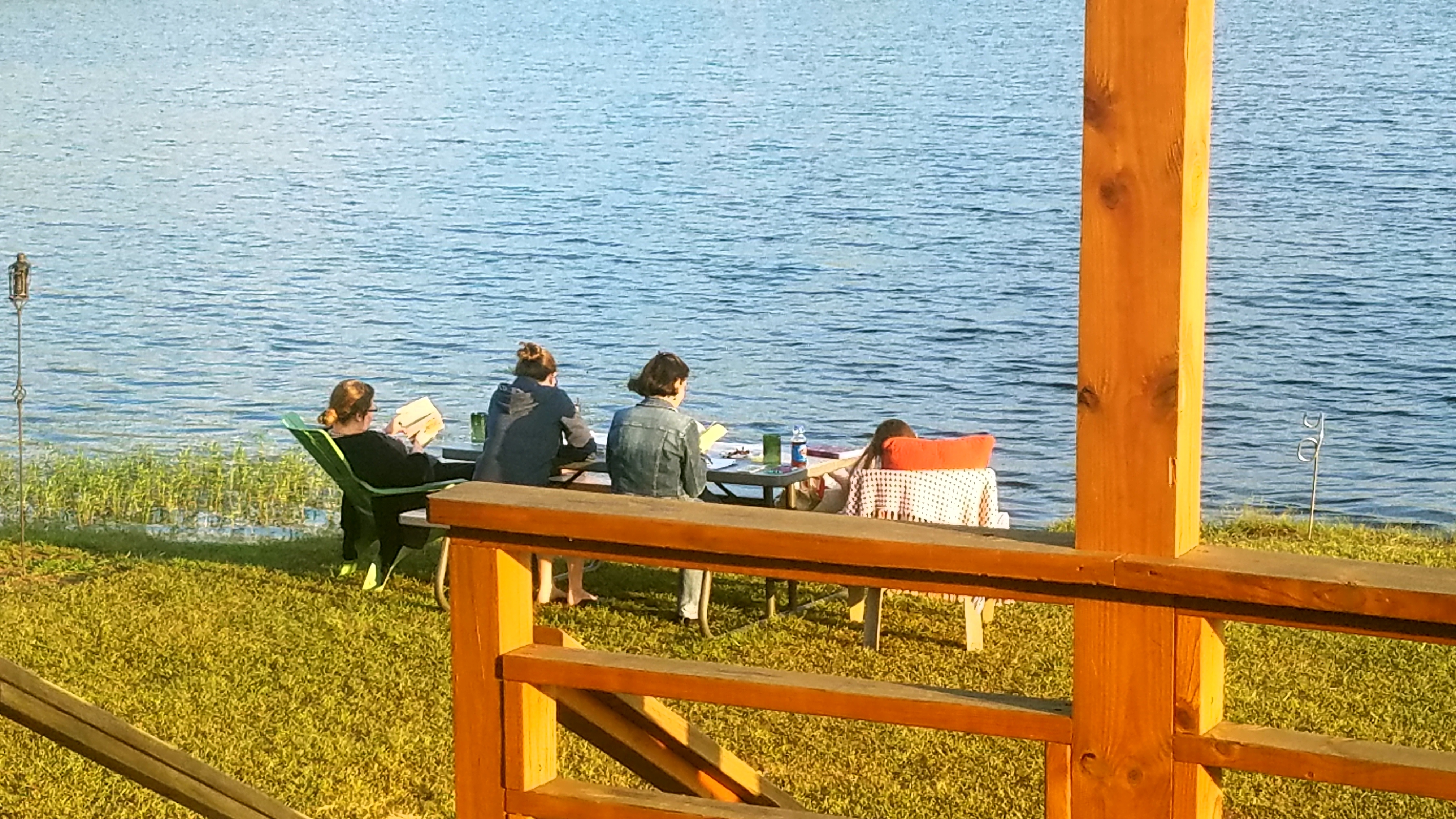 I’m sitting on the front porch in a wooden rocking chair. The sun is beautifully bright reflecting on the surface of the pond and the tiny, rippled waves on the water are soothing to watch. The air is comfortably cool, the breeze is fresh, the bugs are making happy nature-chirps, the cows are starting up their morning chatter in a nearby field, and the wind in the cottonwood next to me sounds like a gently falling rain.